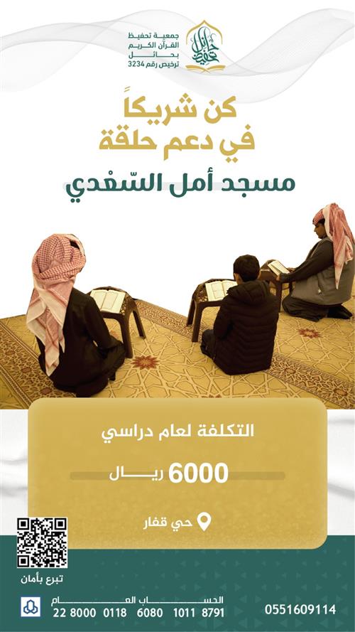 قال صلى الله عليه وسلم - ( خيركم من تعلم القرآن وعلمه ) 15 حافظ في حلقة مسجد امل السعدي ينتظرون دعمك لكي يتعلمون القرآن الكريم إجعل لك نصيب من أجورهم وساهم في دعمهم وشاركهم الأجر ليبقى النور في أمتنا.