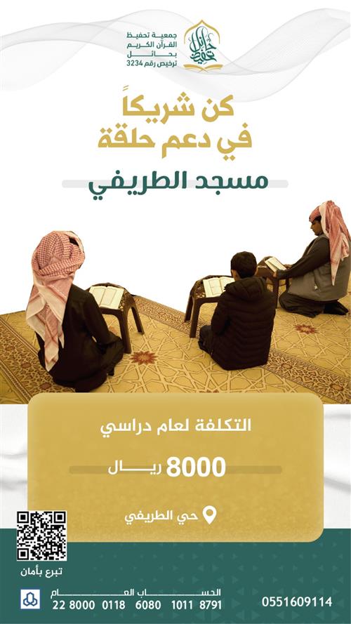 قال صلى الله عليه وسلم - ( خيركم من تعلم القرآن وعلمه ) 15 حافظ في حلقة مسجد الطريفي ينتظرون دعمك لكي يتعلمون القرآن الكريم إجعل لك نصيب من أجورهم وساهم في دعمهم وشاركهم الأجر ليبقى النور في أمتنا.